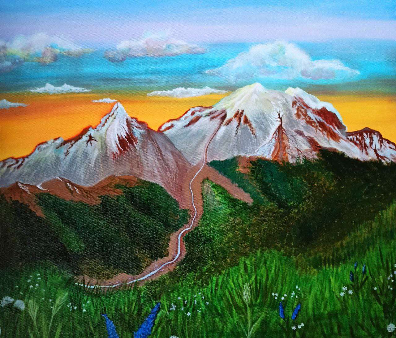 У її полотнах часто з’являються гори. Вони не просто ландшафт — це символ незламності, спокою та гідності. Вони не тиснуть — вони просто є. Мовчазні, глибокі, вічні. Поруч з ними людина не здається малою — вона стає собою.