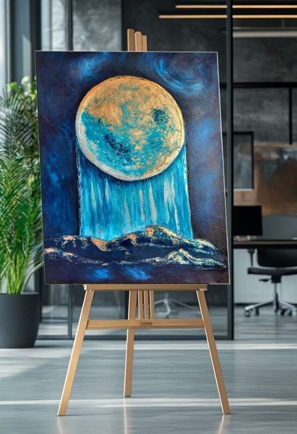Коли я освоїла техніку fluid acrylic, зрозуміла, що її випадковість обмежує моє бажання передати задум та ідею. Техніка перестала бути самоціллю й стала одним із інструментів. Познайомившись із поталлю, я закохалася в цей матеріал. Поталь додає глибину, витонченість і створює інтерактивність: світло відбивається по-різному залежно від кута, додаючи містичної атмосфери. У картині «Водоспад» золотою поталлю я зобразила місяць, а срібною — водоспад. Це одна з моїх улюблених робіт із сюрреалістичним сюжетом, де поєднуються потужність і заспокоєність.