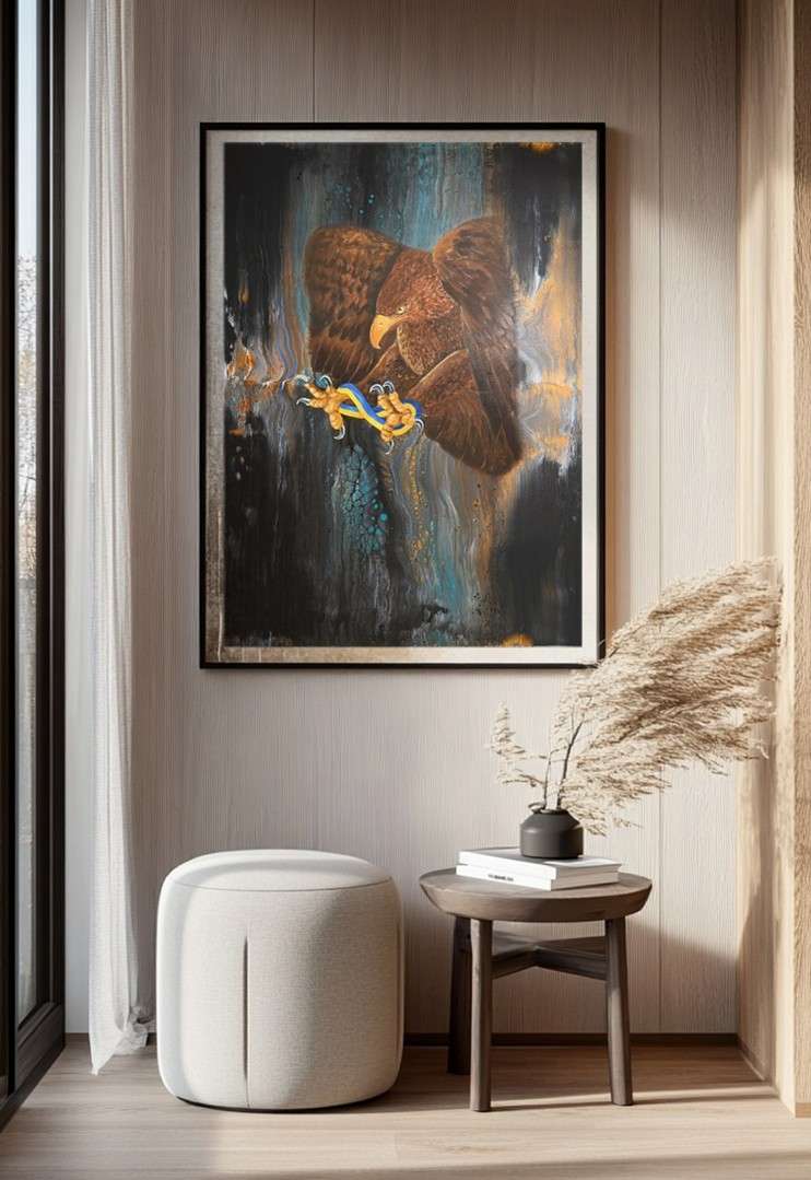Друга виставка спільноти, де брала участь моя картина «Останній бар’єр», — це «Крилата свобода». Робота уособлює прагнення українців до свободи й особлива для мене: вона написана 22.02.24, за день до війни. На картині зображено орла, лапи якого сплутує стрічка з українськими кольорами, заважаючи наблизитись до цілі. Україна — останній бар’єр, що зупиняє агресора. Якщо Європа не допоможе, його кігті дотягнуться й до інших країн.